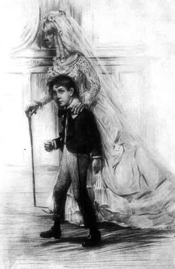 In an arm chair sat the strangest lady I have ever seen or shall ever see. She was dressed in rich white—in satin and lace and silks—all of white. Even her shoes were white, and she had a long white veil dependent from her hair, and bridal flowers in her hair,—and the hair, too, was white. Some bright jewels sparkled on her neck and hands and others lay sparkling on the table. Dresses, less splendid than the one she wore, and half-packed trunks, were scattered about. She had but one shoe on and the other was on the table near by—her veil was but half arranged; her watch and chain were not put on; and there were lace, trinkets, handkerchief, gloves, some flowers, and a Prayer-book in a heap before the looking-glass. Then she spoke, "Who is it?"