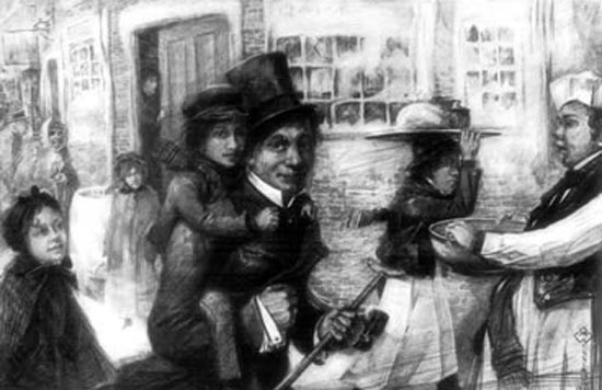 While Bob took Tiny Tim to church, preparations for the feast were going on at home. Mrs. Crachit was dressed in a twice-turned gown, but brave in ribbons which are cheap and make a goodly show for sixpence; and she laid the cloth, assisted by Belinda, second of her daughters, also brave in ribbons, while Master Peter Crachit plunged a fork into a saucepan full of potatoes, getting the corners of his monstrous shirt collar (Bob's private property, conferred upon his son and heir in honour of the day) into his mouth, but rejoiced to find himself so finely dressed, and yearning to show his linen in the fashionable Parks.